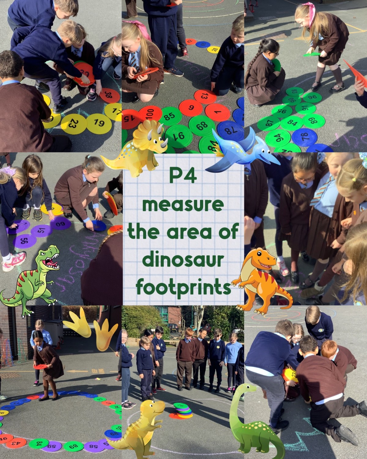 The girls and boys in P4 had great fun in the sun, measuring the area of ‘dinosaur footprints’ using non‑standard units. They worked brilliantly together, comparing sizes and discovering just how big a dinosaur’s footstep could have been!